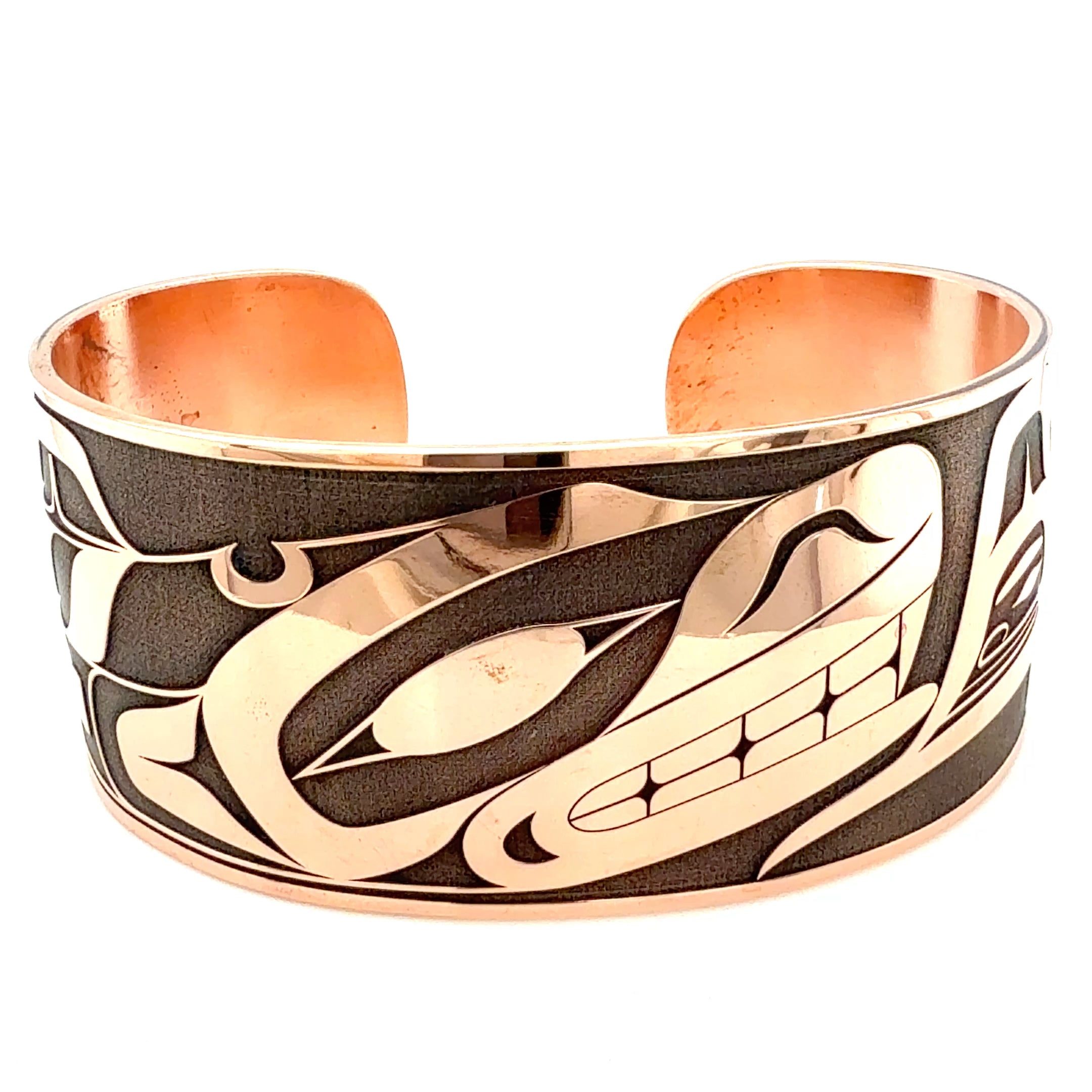 Wide copper bracelet with killer whale design
